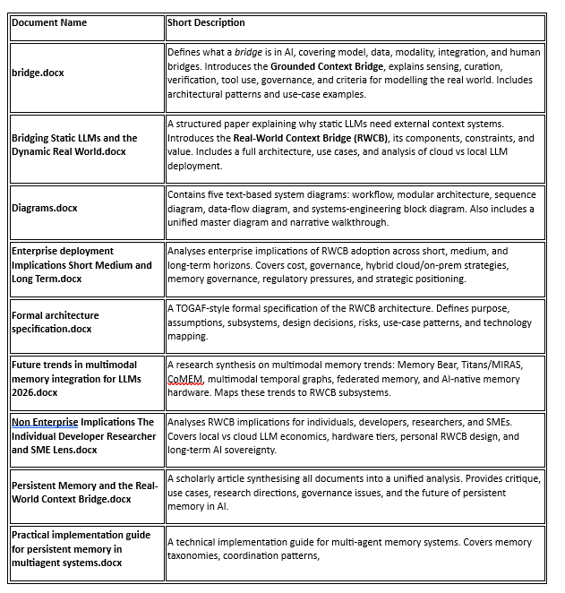 The Real-World Context Bridge, as a framework and as an architecture, represents a robust publicly documented approach to this problem currently available. Its strengths are significant: modular design, explicit separation of concerns, governance-first orientation, and alignment with both academic research directions and commercial development trajectories. Its gaps the missing forgetting model, the absent causal chain modelling, the underdeveloped evaluation framework are addressable and the research to address them exists.