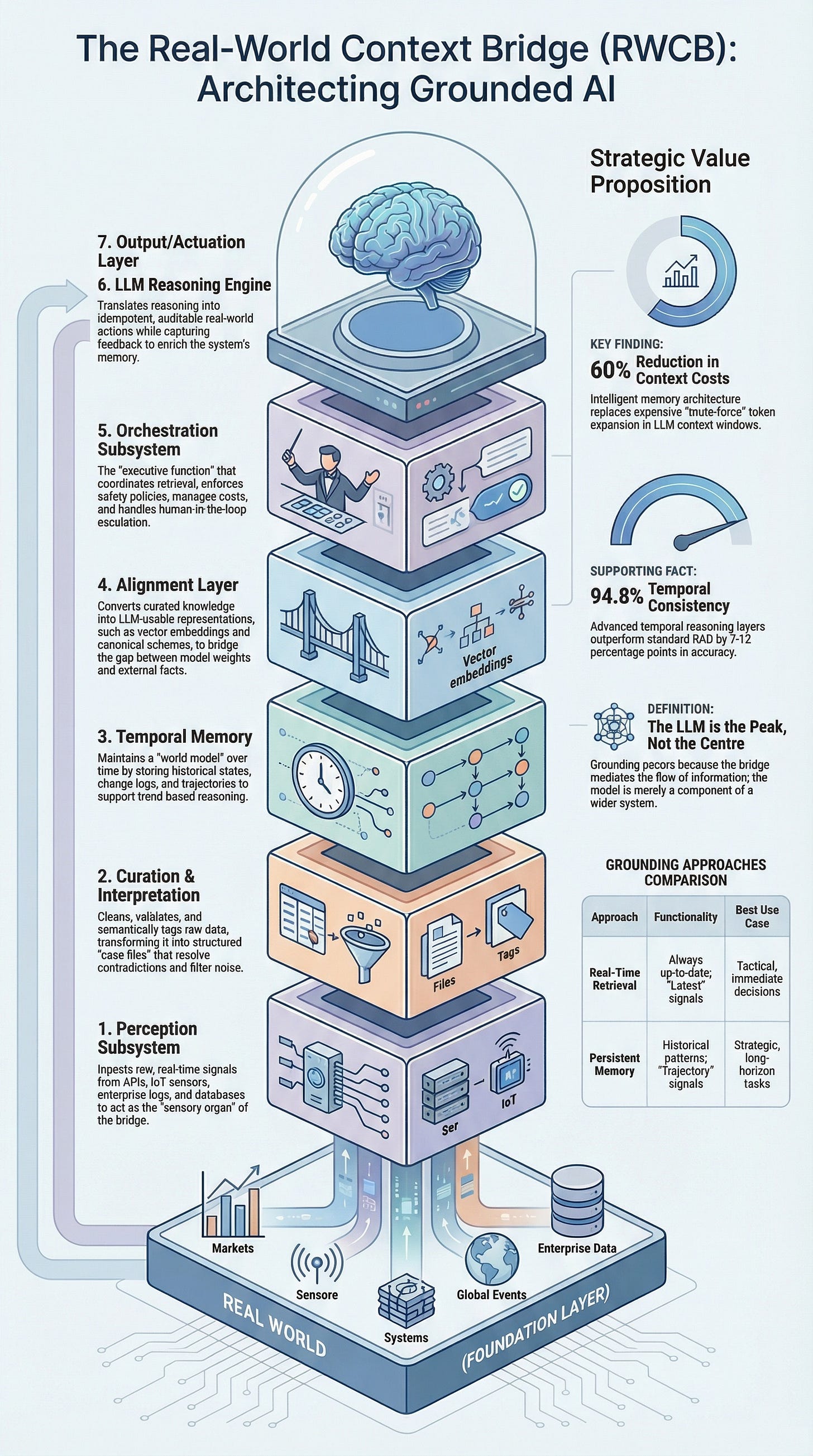 The Real-World Context Bridge (RWCB) is a structured framework for solving the grounding problem. It is a layered infrastructure stack that sits between a static LLM and the dynamic external world, mediating the flow of information in both directions. It is not a product it is an architecture pattern, analogous in its role to how enterprise integration middleware mediated between legacy systems and modern applications in an earlier era of technology.
